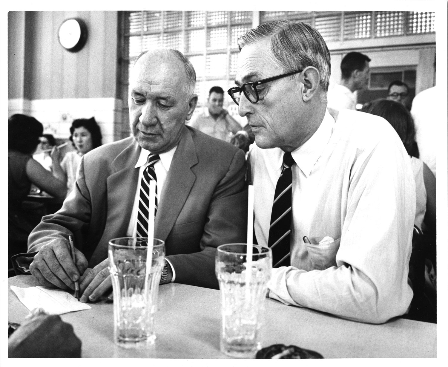 President William R. Ross sits with former University President Dr. George Frasier at a table in Bru-Inn in June of 1956.